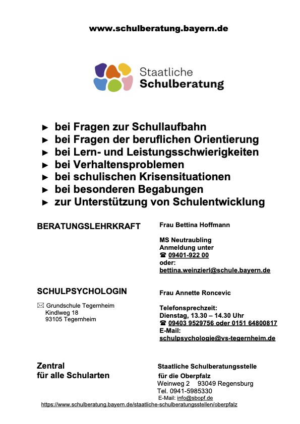 | Zentral für alle Schularten | Staatliche Schulberatungsstelle für die Oberpfalz Weinweg 2 93049 Regensburg Telefon: 0941-5985330 Mail: info@sbopf.de https://www.schulberatung.bayern.de/staatliche-schulberatungsstellen/oberpfalz |